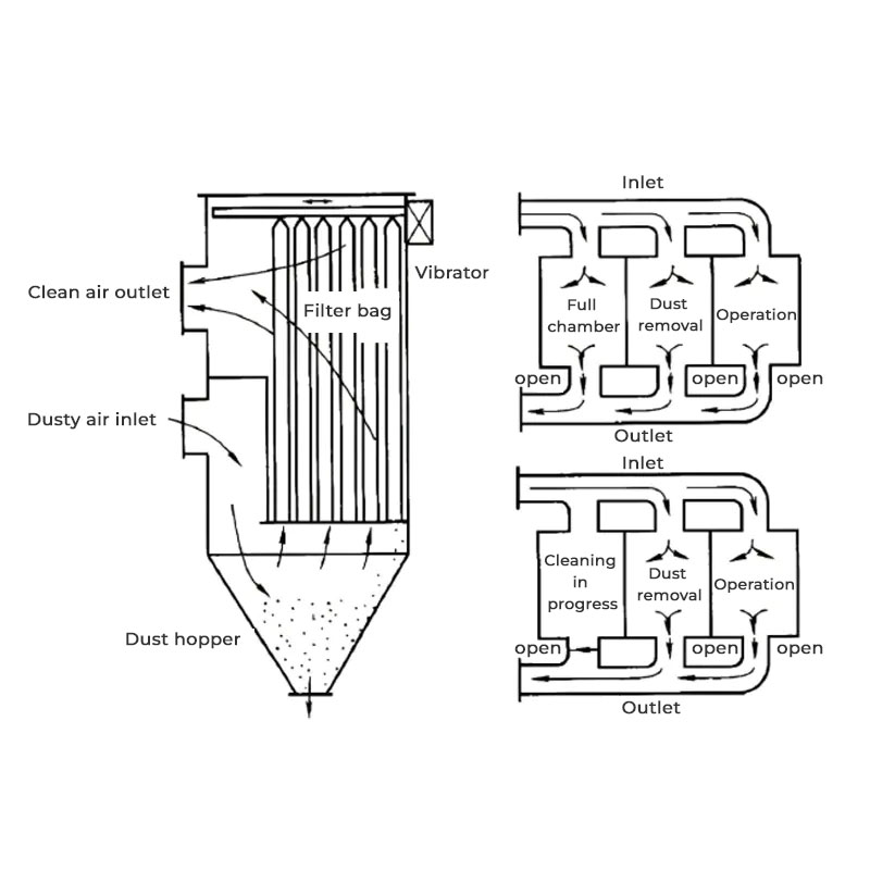 Kernedriftsprincippet for en støvopsamler til rengøring af mekanisk vibration er at bruge vibrationskraften, der genereres af mekanisk vibration, til at fjerne støv fra filterposen. Vibrationsmekanismen overfører vibrationer til filterposen gennem en række vibrerende stænger eller en vibrerende platform. På grund af den høje vibrationsfrekvens løsnes støv på overfladen af filterposerne og føres væk med luftstrømmen. Denne rengøringsmetode sikrer støvopsamlereffektivitet og forlænger udstyrets levetid.